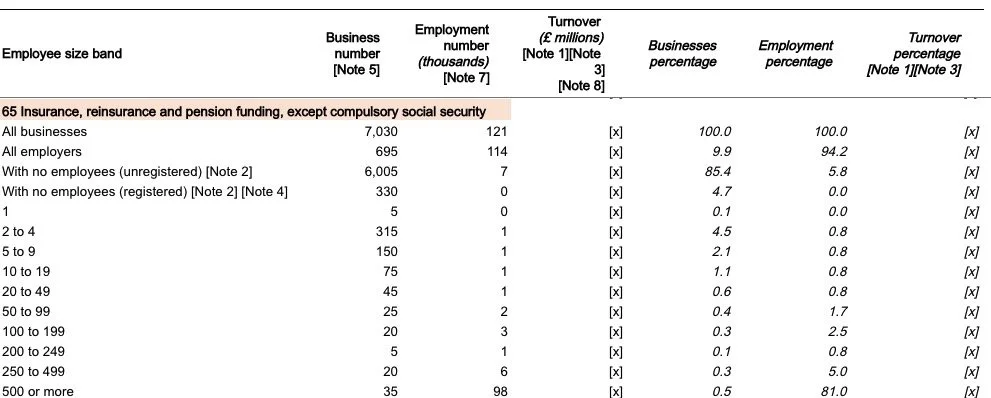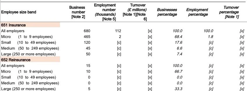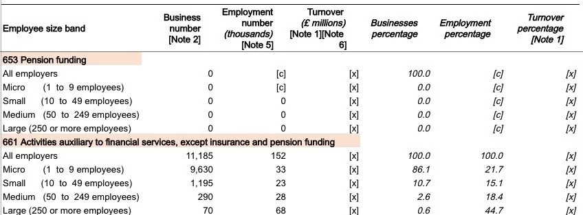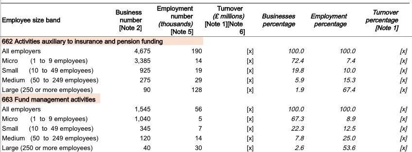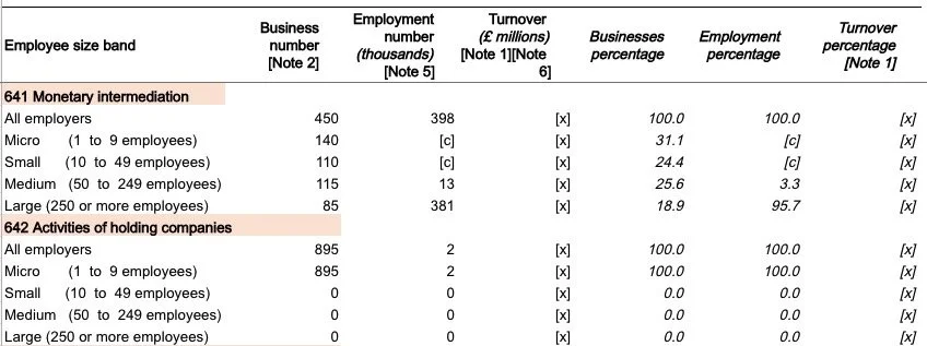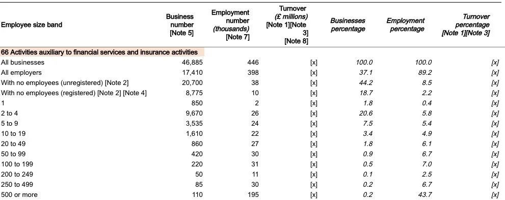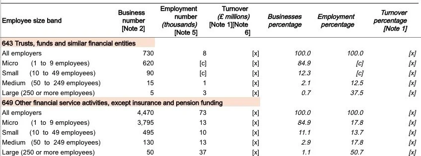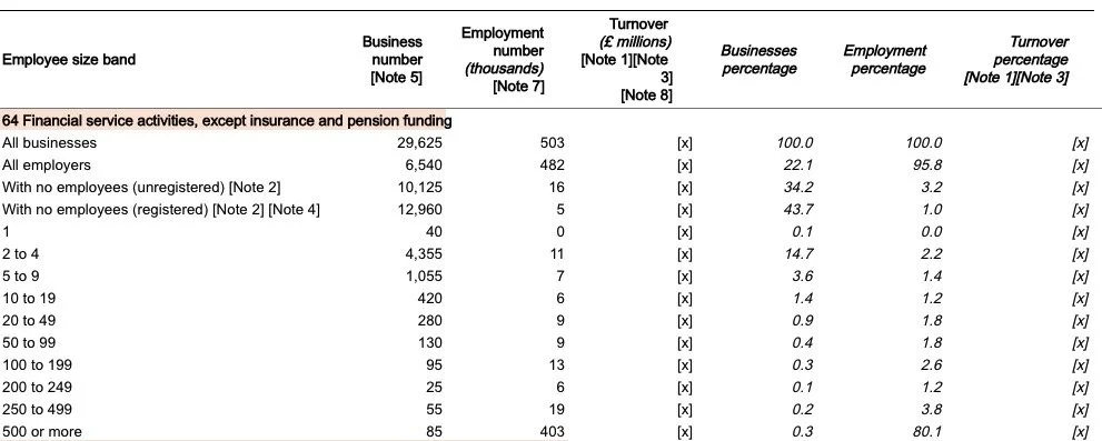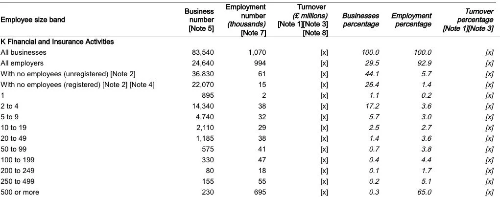 Number of businesses in the UK financial services sector and their associated employment (turnover figures unavailable)