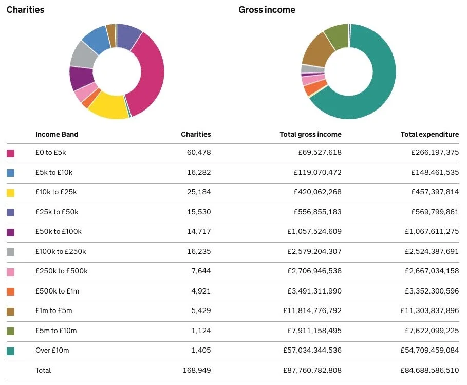Accurate as at 30 April 2023. Source: https://register-of-charities.charitycommission.gov.uk/sector-data/charities-by-income-band