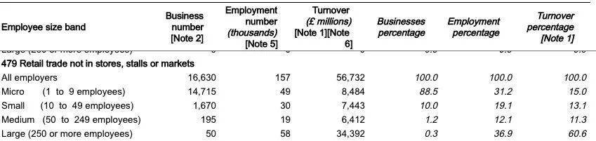 Number of businesses in the UK wholesale and retail trade and their associated employment and turnover